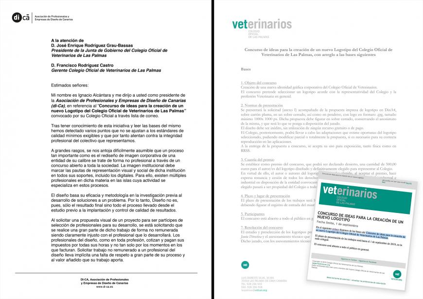 Mi nombre es Ignacio Alcántara y me dirijo a usted como presidente de la Asociación de Profesionales y Empresas de Diseño de Canarias (di-Ca), en referencia al “Concurso de ideas para la creación de un nuevo Logotipo del Colegio Oficial de Veterinarios de Las Palmas” convocado por su Colegio Oficial a través lista de correo.