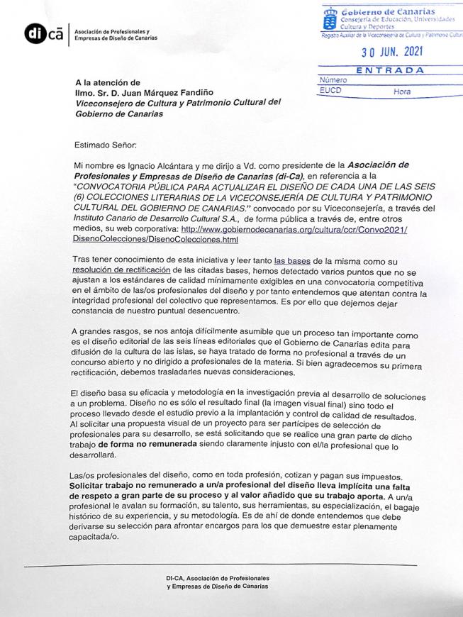 Mi nombre es Ignacio Alcántara y me dirijo a Vd. como presidente de la Asociación de Profesionales y Empresas de Diseño de Canarias (di-Ca), en referencia a la “CONVOCATORIA PÚBLICA PARA ACTUALIZAR EL DISEÑO DE CADA UNA DE LAS SEIS (6) COLECCIONES LITERARIAS DE LA VICECONSEJERÍA DE CULTURA Y PATRIMONIO CULTURAL DEL GOBIERNO DE CANARIAS.” convocada por su Viceconsejería, a través del Instituto Canario de Desarrollo Cultural S.A., de forma pública a través de, entre otros medios, su web corporativa: http://www.gobiernodecanarias.org/cultura/ccr/Convo2021/DisenoColecciones/DisenoColecciones.html