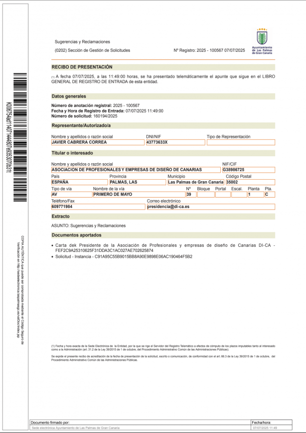 Mi nombre es Javier Cabrera y me dirijo a ustedes como presidente de la Asociación de Profesionales y Empresas de Diseño de Canarias (DI-CA), asociación miembro de la Red Española de Asociaciones de Diseño (READ) y de BEDA - The Bureau of European Design Associations, en referencia a la “CONVOCATORIA PÚBLICA PARA LA SELECCIÓN DEL CARTEL DEL CARNAVAL, DE INTERÉS TURÍSTICO INTERNACIONAL, DE LAS PALMAS DE GRAN CANARIA 2026” convocado por su ayuntamiento a través de la Sociedad de Promoción de Las Palmas de Gran Canaria.