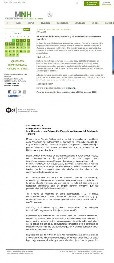 Habiendo sido informados de dicha convocatoria a través de los medios de comunicación y la publicación en su página web, permítanos manifestarles nuestra más directa consternación por el maltrato que la misma conlleva de forma taxativa hacia los profesionales del diseño de las Islas y más concretamente de su misma isla.