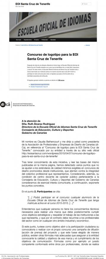 Tras tener conocimiento de esta iniciativa, y leer las bases del mismo publicadas en la misma página, hemos detectado varios puntos que no se ajustan a los estándares de calidad mínimos exigibles en concursos de diseño promovidos desde instituciones, que atentan contra la integridad del colectivo profesional que representamos. Considerando, además, su condición de centro docente de carácter público perteneciente a la Consejería de Educación, Cultura y Deportes del Gobierno de Canarias consideramos de esencial interés comunicarle, a continuación, exponerle los puntos concretos.