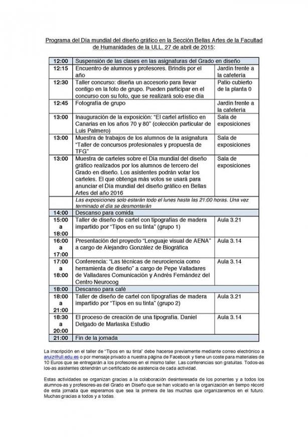 Para conmemorar el Día Internacional del Diseño, la ULL celebrará unas jornadas que tendrán lugar en la Sección Bellas Artes de la Facultad de Humanidades de la ULL, el próximo día 27 de abril de 2015. El programa es: