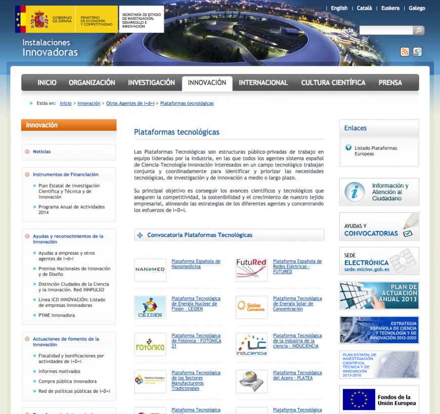 Desde el año 2004 y por indicación de la Unión Europea, el Gobierno español ha ido creando diversas estructuras público-privadas de trabajo en las que todos los agentes interesados en un campo concreto trabajan en equipo y coordinadamente para identificar necesidades tecnológicas, de investigación y de innovación a medio o largo plazo.