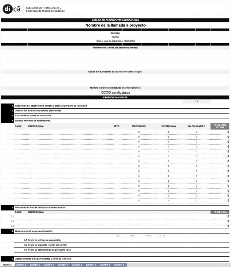 • Se abre el proceso de valoración de forma oral. Cada miembro del comité comunica al resto sus puntuaciones por candidato y entrega la hoja escrita. En paralelo, el miembro de la directiva de di-Ca va tomando nota en la hoja de cálculo preparada para dicho proceso para el cálculo final de media de puntuaciones: