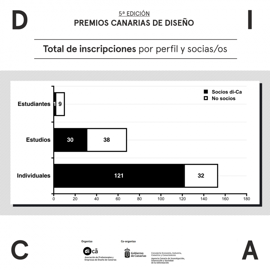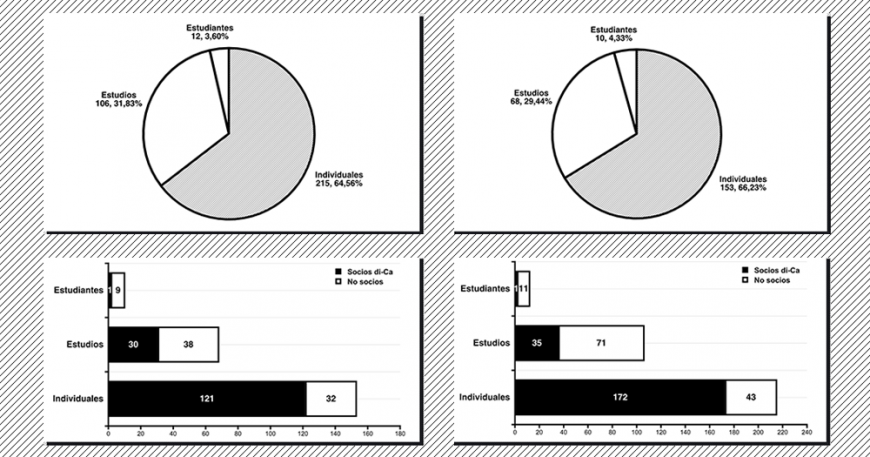 Cabe destacar que la mayor parte de las inscripciones pertenecen a socios de di-Ca, un total de 152, mientras que los 79 restantes fueron registros de profesionales no asociados. En cuanto a las piezas inscritas, 208 fueron realizadas por miembros de la Asociación y 125 por otros profesionales.
