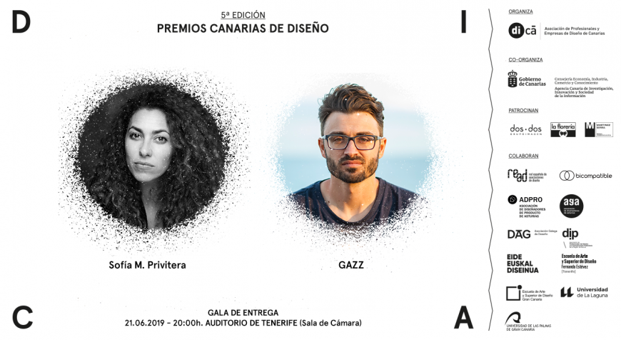 La actriz, guionista y productora Sofía M. Privitera, y el actor y comunicador visual Christophe Gaziello (GAZZ), presentarán este viernes la gala de entrega de los premios de la quinta edición de los Premios Canarias de Diseño que la Asociación de Profesionales de Diseño de Canarias (di-Ca) co-organiza junto a la Agencia Canaria de Investigación, Innovación y Sociedad de la Información (ACIISI) del Gobierno de Canarias.