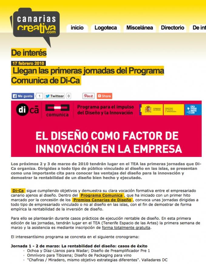 Di-Ca sigue cumpliendo objetivos y demuestra su clara vocación formativa entre el empresariado canario ajenos al diseño. Dentro del Programa Comunica, que ha iniciado con un primer hito marcado por la concesión de los Premios Canarias de Diseño, convoca unas jornadas dirigidas a todo tipo de empresariado vinculado o no al diseño en las islas, con el fin de demostrar de forma empírica la rentabilidad de la inversión de diseño.